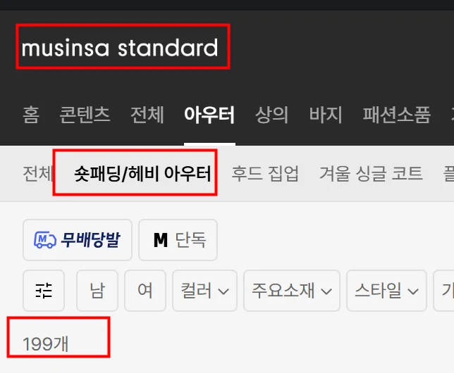 무신사는 어떤가. 숏 패딩만 해도 200개고, 롱패딩까지 하면 거의 300개일 거다. 여기서 무탠다드 스포츠류를 추가하면 거의 400개일 거고.